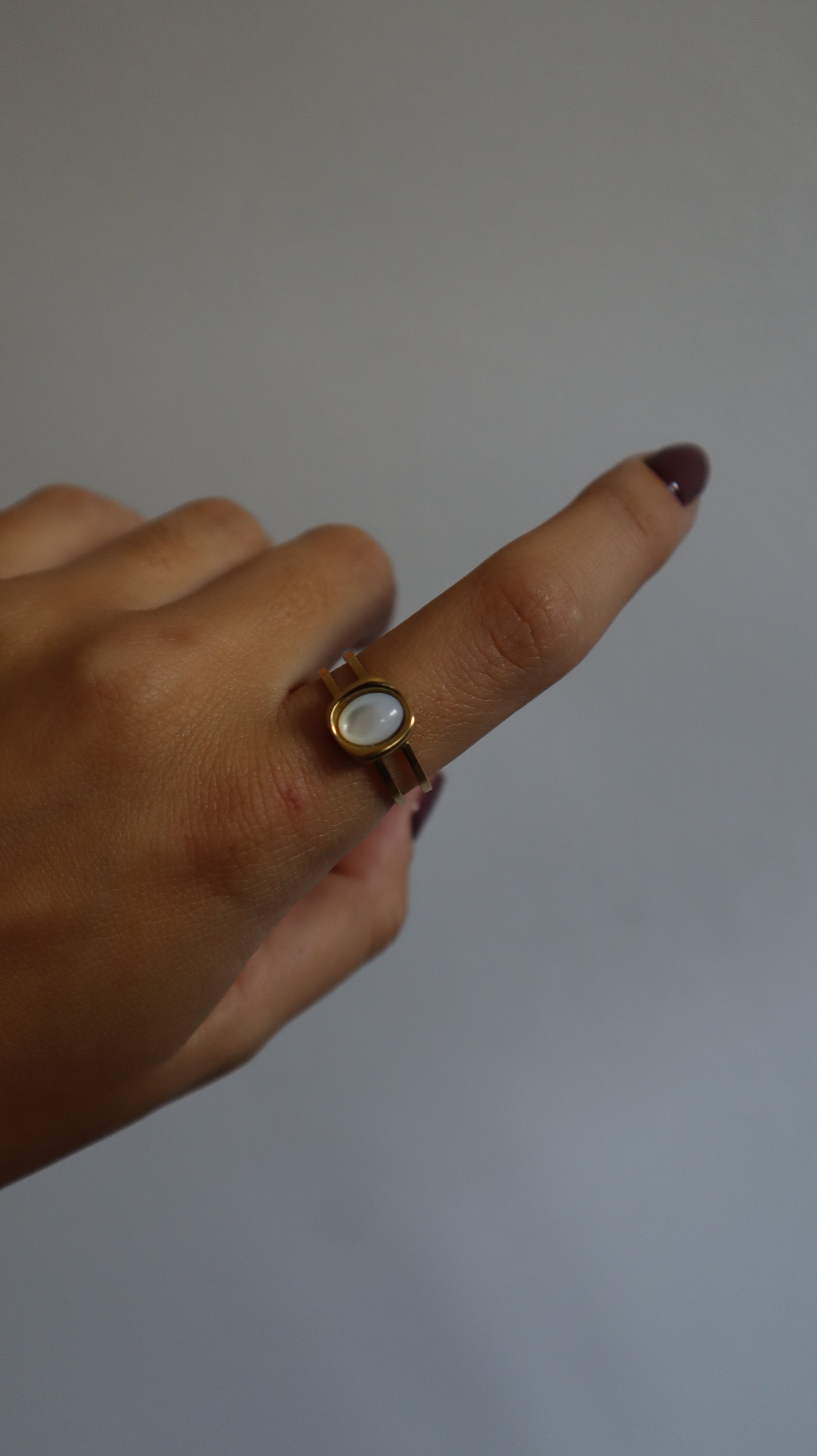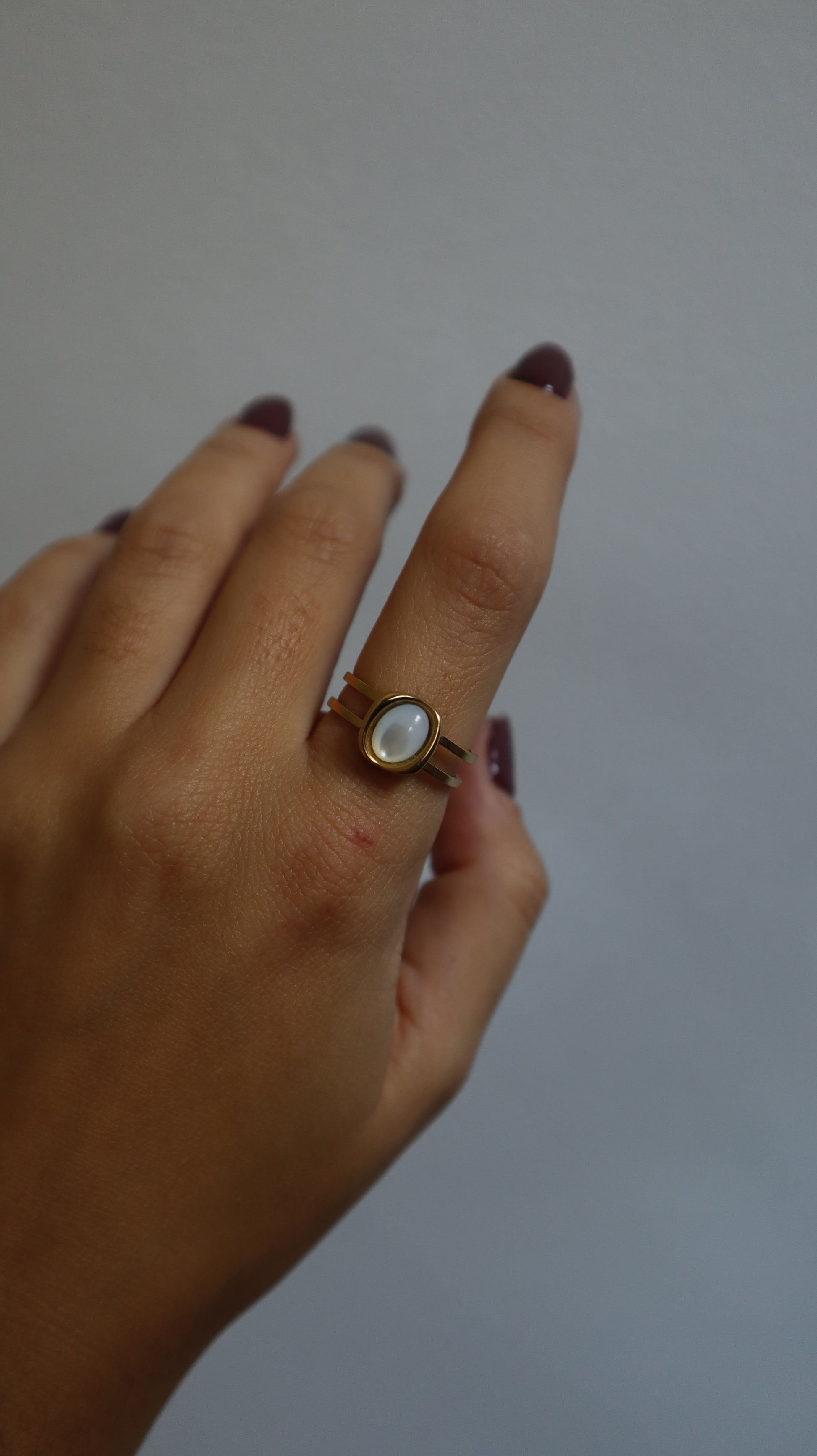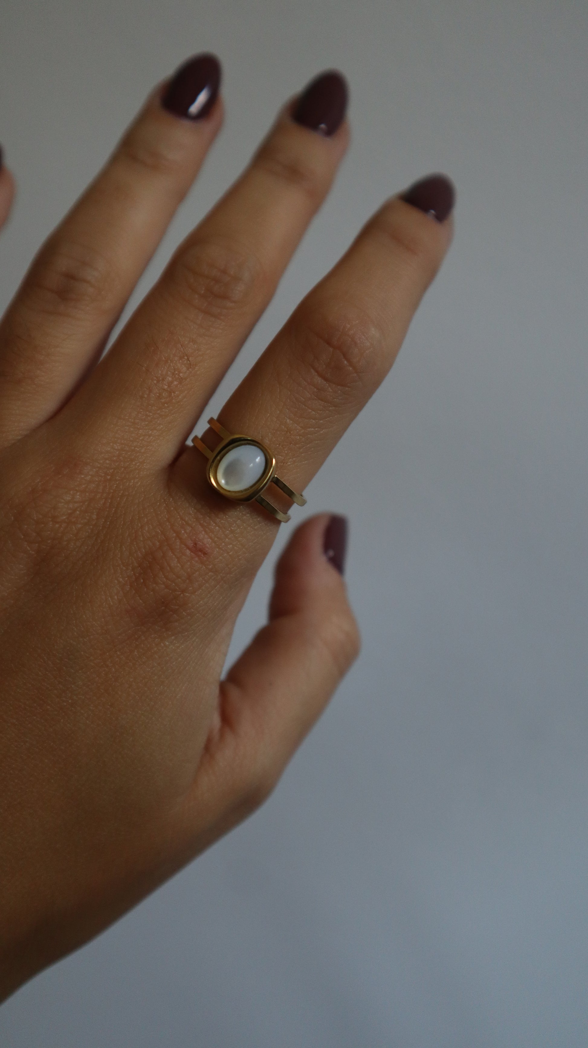 O Anel Timo combina um aro minimalista com o toque orgânico de uma pérola de água doce ao centro. É uma peça delicada mas com presença: o brilho natural da pérola contrasta com o acabamento polido do aro, criando um look elegante para o dia a dia ou para ocasiões especiais.