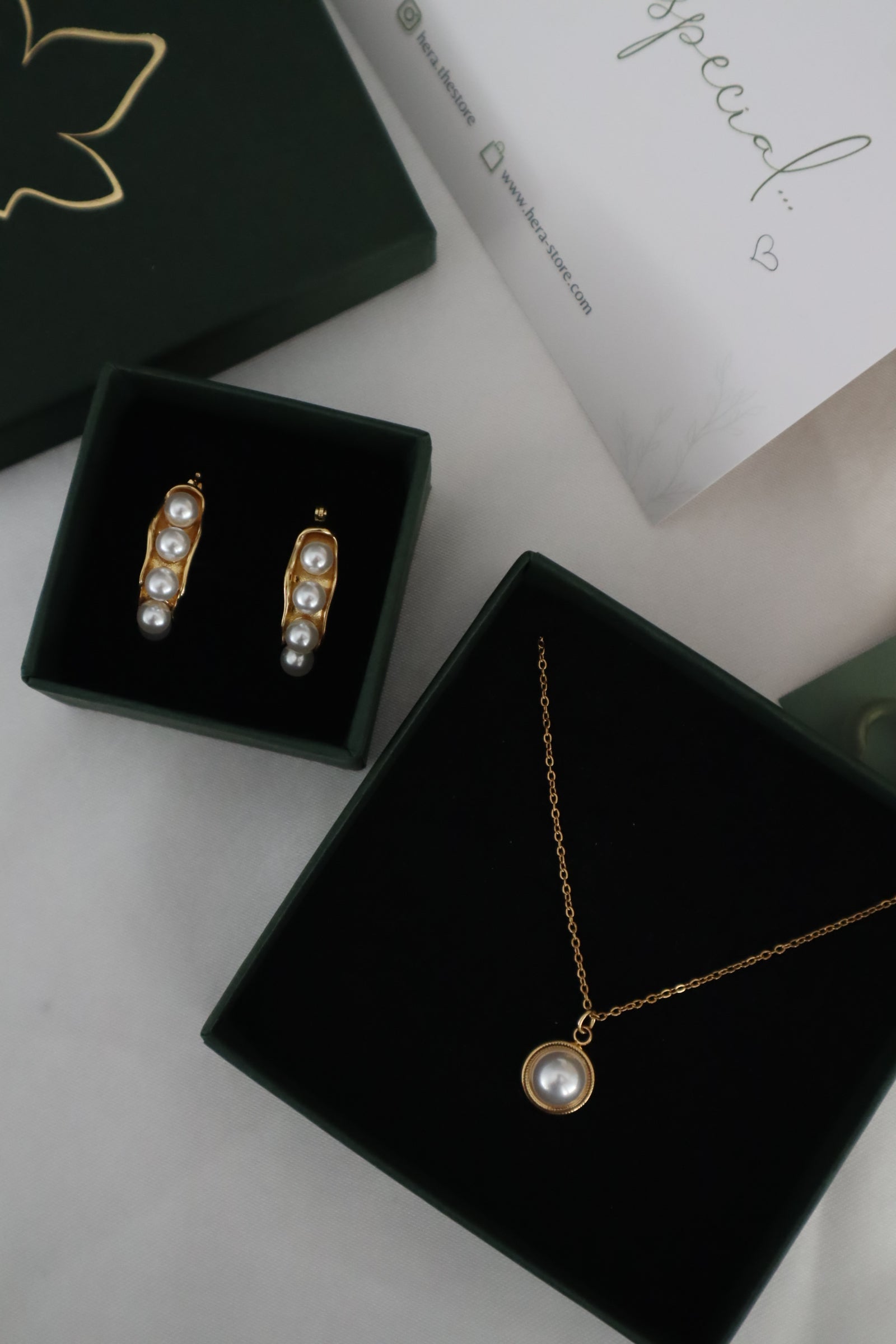 Combinámos o colar Tília com os brincos Flora, um conjunto elegante, ambos com pedras de água doce.